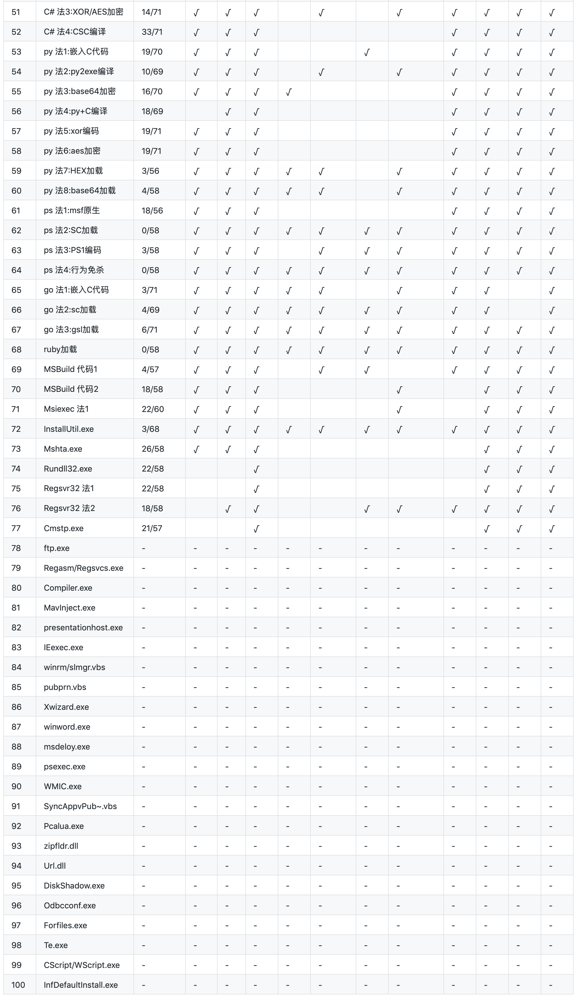 - 常见免杀白名单程序(113个):Rundll32.exe、Msiexec.exe、MSBuild.exe、InstallUtil.exe、Mshta.exe、Regsvr32.exe、Cmstp.exe、CScript.exe、WScript.exe、Forfiles.exe、te.exe、Odbcconf.exe、InfDefaultInstall.exe、Diskshadow.exe、PsExec.exe、Msdeploy.exe、Winword.exe、Regasm.exe、Regsvcs.exe、Ftp.exe、pubprn.vbs、winrm.vbs、slmgr.vbs、Xwizard.exe、Compiler.exe、IEExec.exe、MavInject32、Presentationhost.exe、Wmic.exe、Pcalua.exe、Url.dll、zipfldr.dll、Syncappvpublishingserver.vbs等。