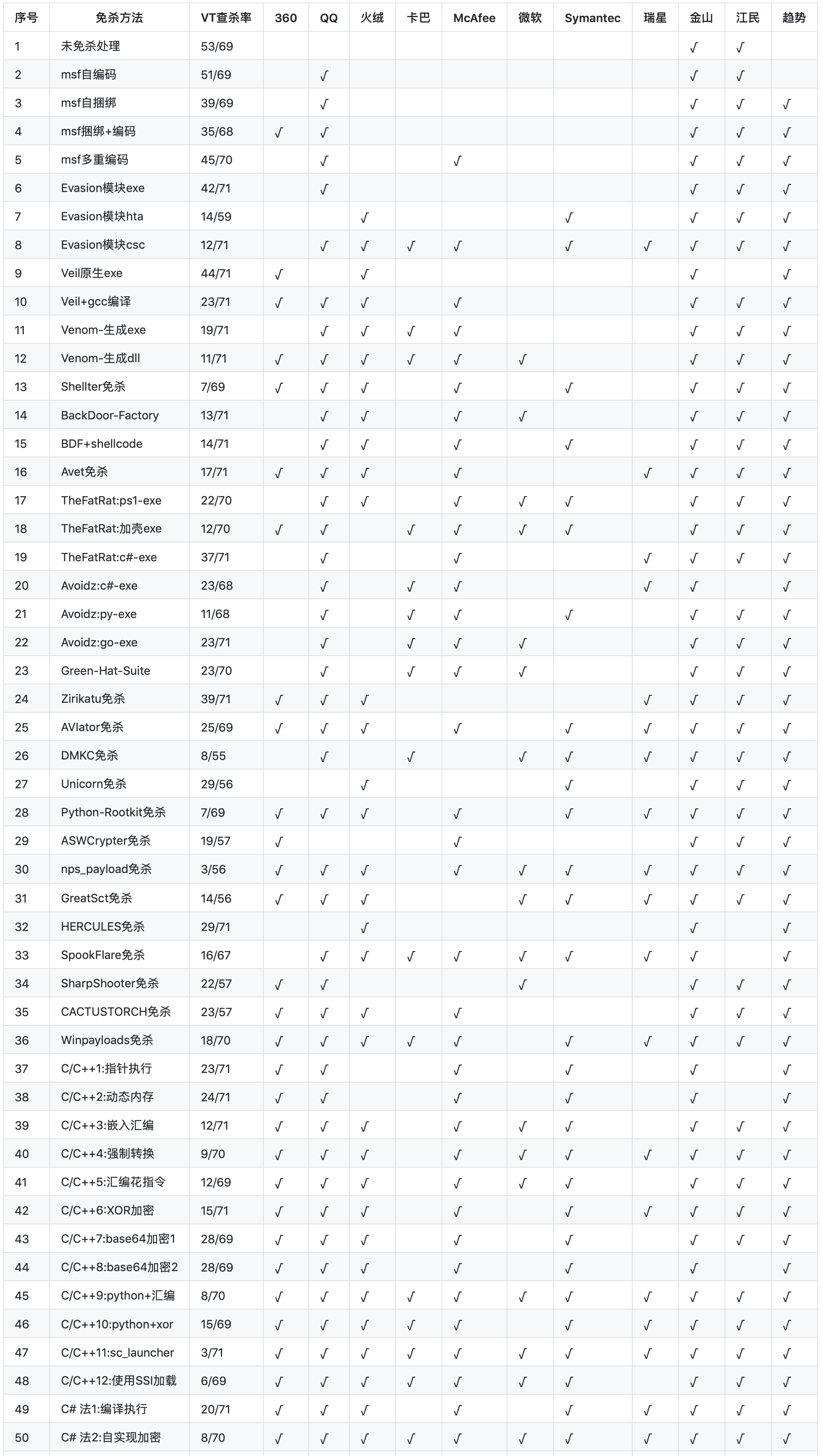 | 序号 | 免杀方法 | 2020年VT | 2022年VT | 360 | 火绒 | 卡巴 | McAfee | 微软 | Symantec | 瑞星 | 金山 | 江民 | 趋势 | |